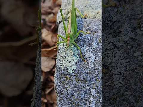 Beschreibung: Ein grüner Katydid (Laubheuschrecke), perfekt getarnt auf moosigem Stein – ein Meisterwerk der natürlichen Anpassung. Mit seinen langen Antennen und dem rötlichen Rückenstreifen verschmilzt er mit seiner Umgebung.